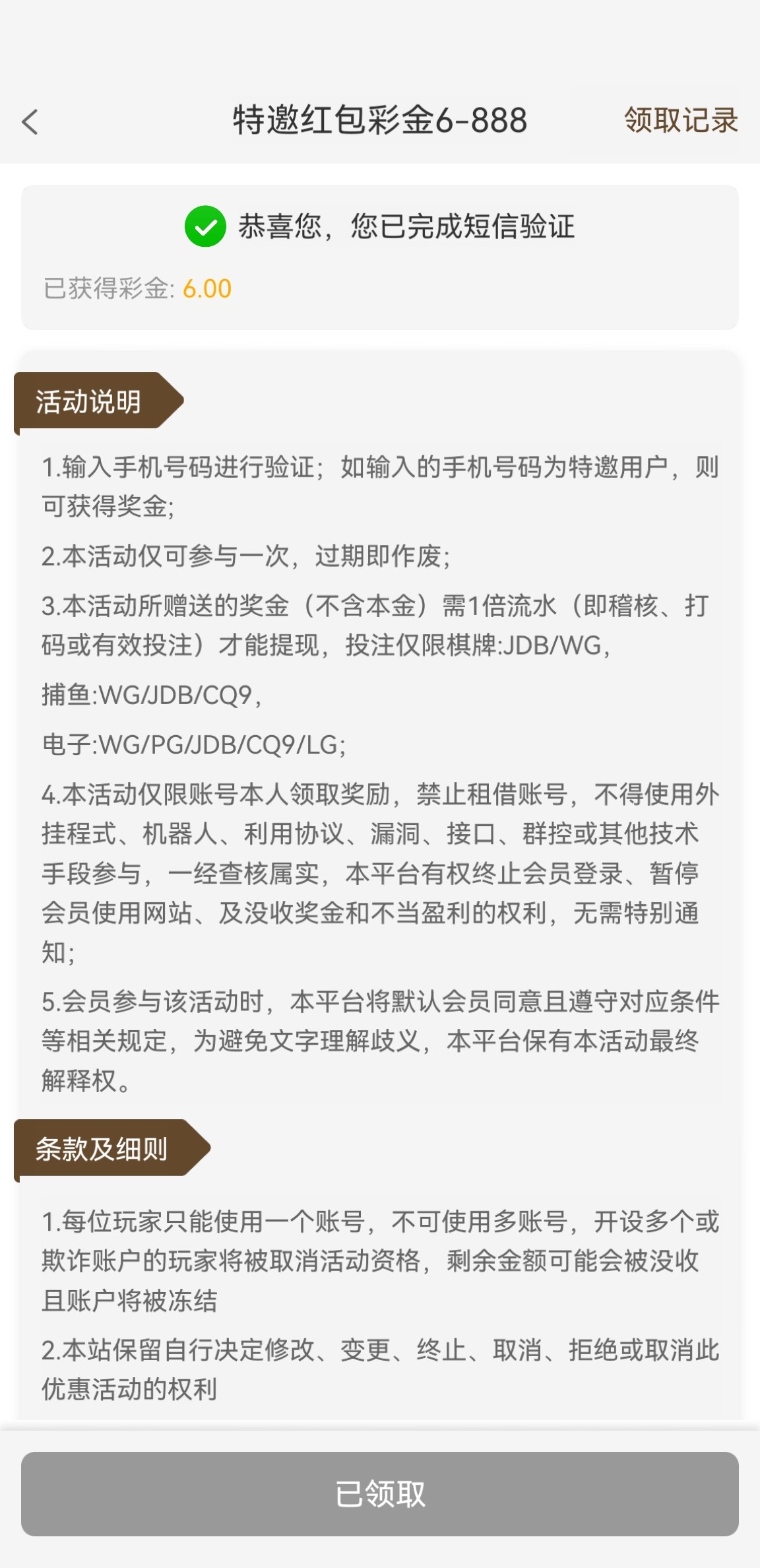 这个913不是经常发的那个913,另外一个高仿通宝系列的,输入手机号成功收取验证码的话就能领取彩金。