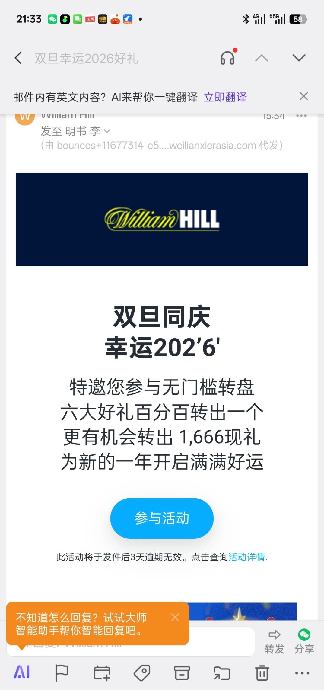 我是收到邮箱的,上线里面有个幸运2026活动点进去旋转就能抽奖,我抽到了66有号的可以去看看https://www.williamhill7679.com:9001/zh-cn/login