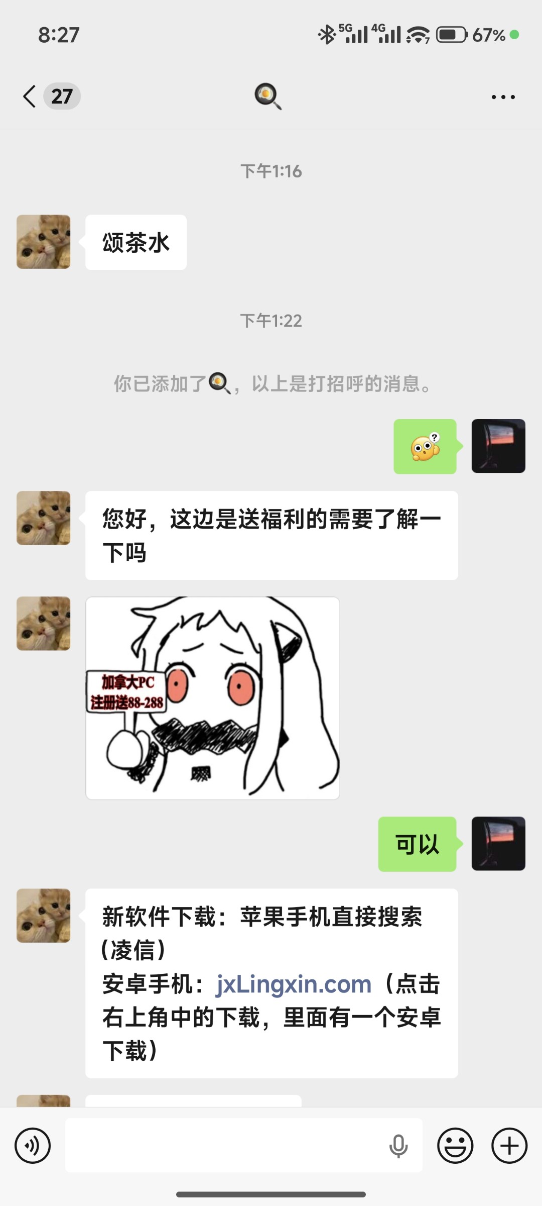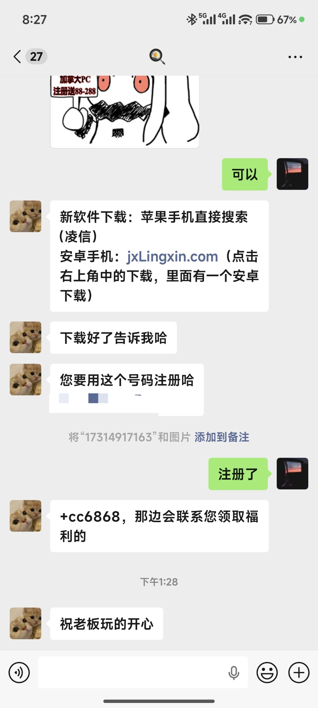 是那种群里打字下注的的28,我看了开奖号码跟加拿大28是同步的,聊天软件注册后会自动添加他们的客服(不确定是不是只有特邀才会自动添加客服)