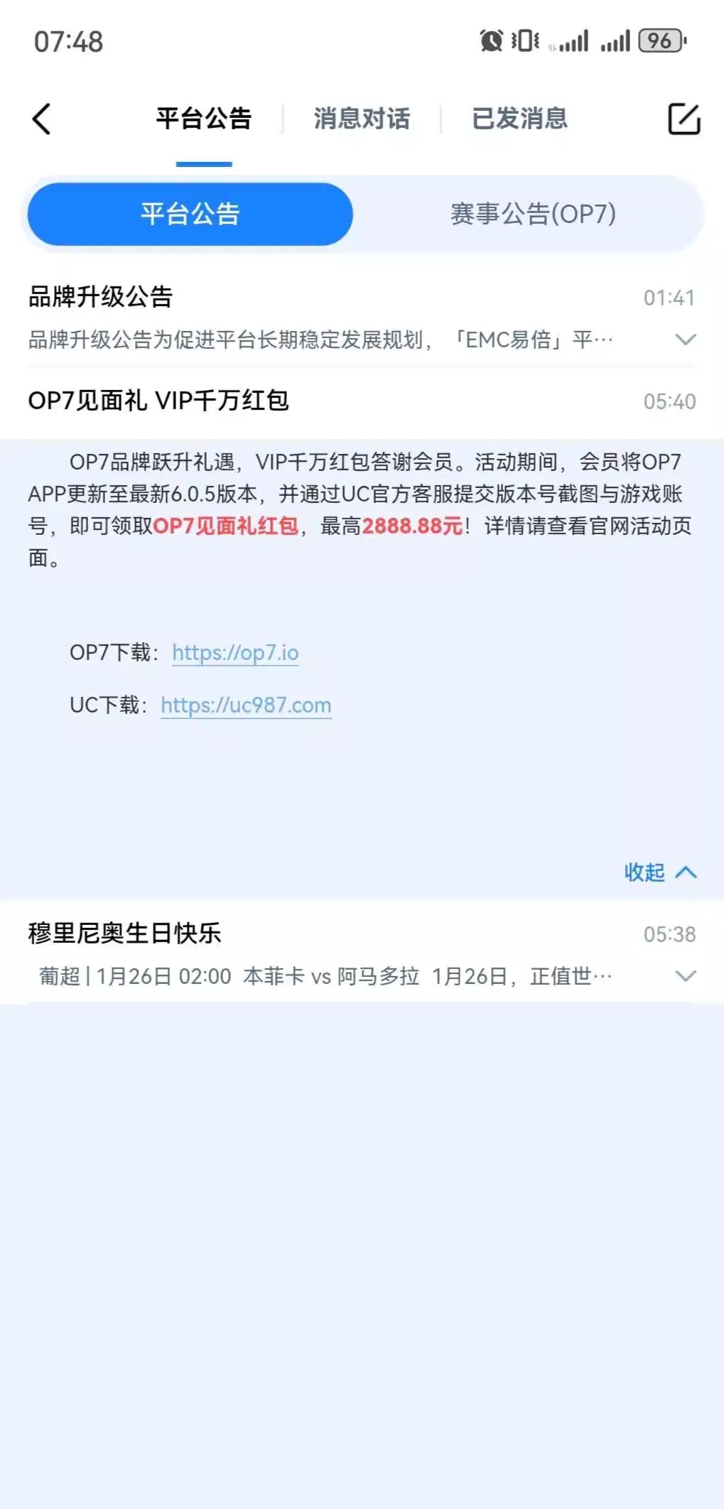 玩过的直接下载注册uc,找客服截图账号领取,客服回的慢,发了东西等着登记了再福利中心领,根据vip等级送的彩金,网址:op7.io