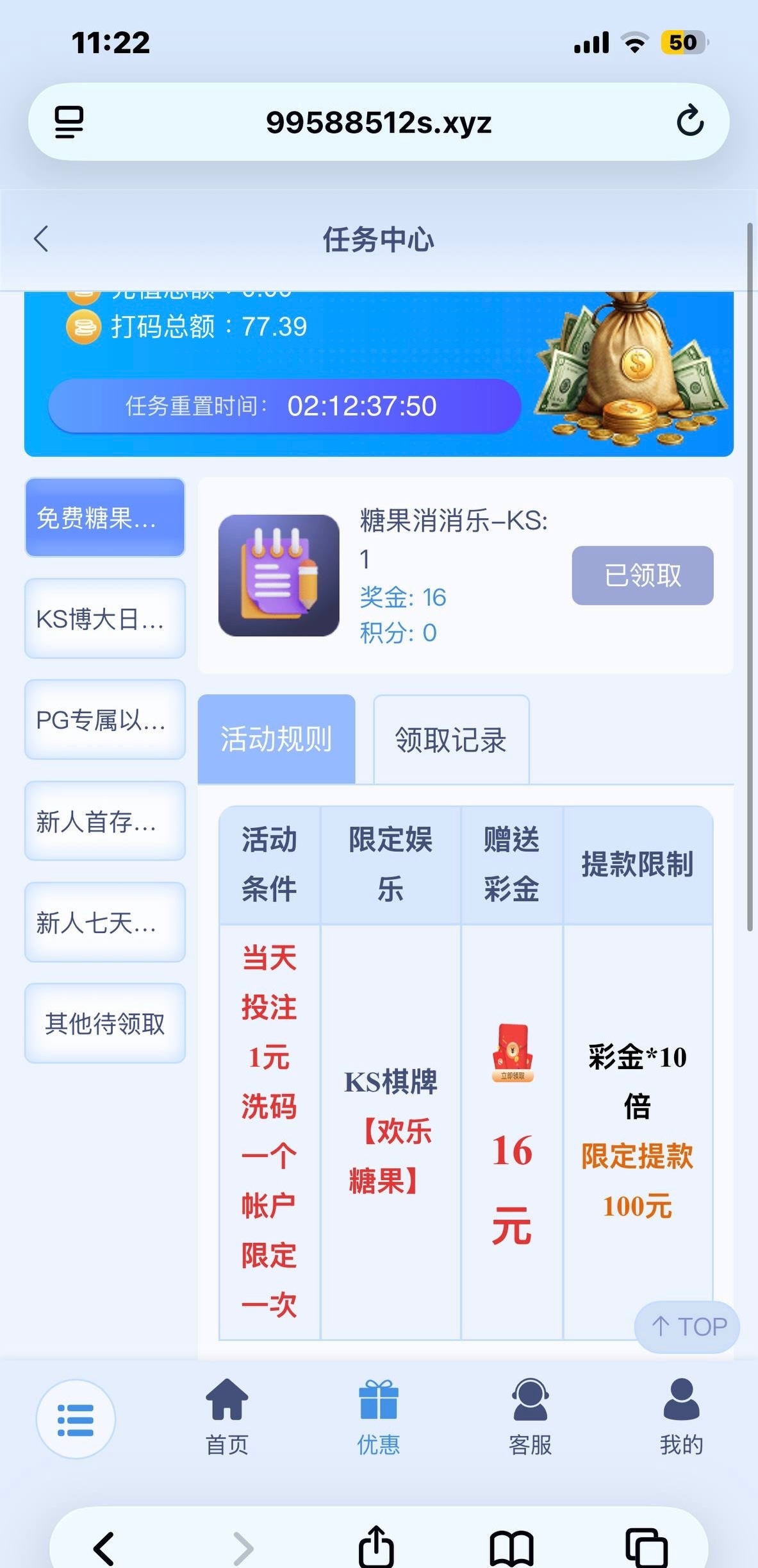 拿返水投1块钱就能领16元,只能打欢乐糖果,一注两块有水,提了100,梦想有号的可以去搞一波