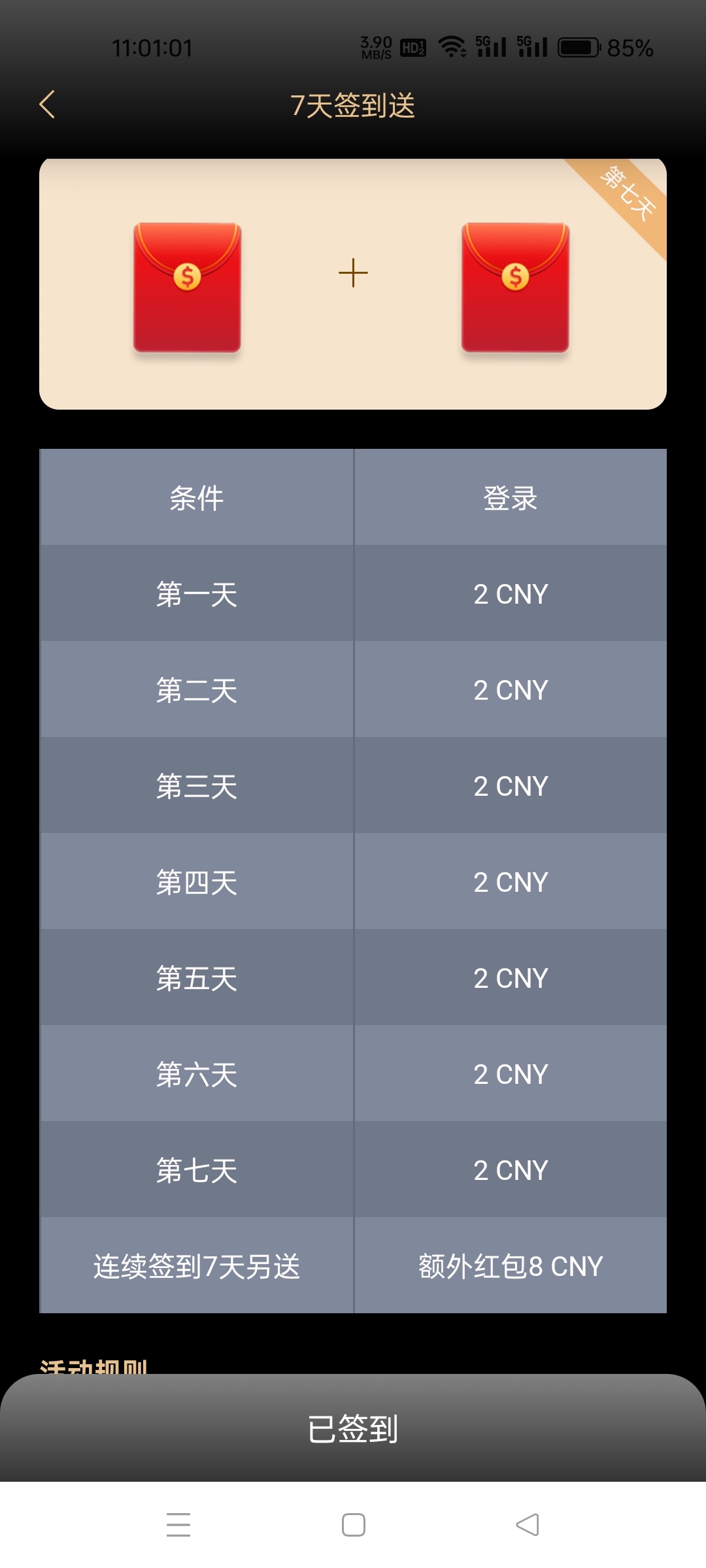 金沙娱乐场每日签到可以2元,连续签到7天额外领8元,一共能领22元不要充值