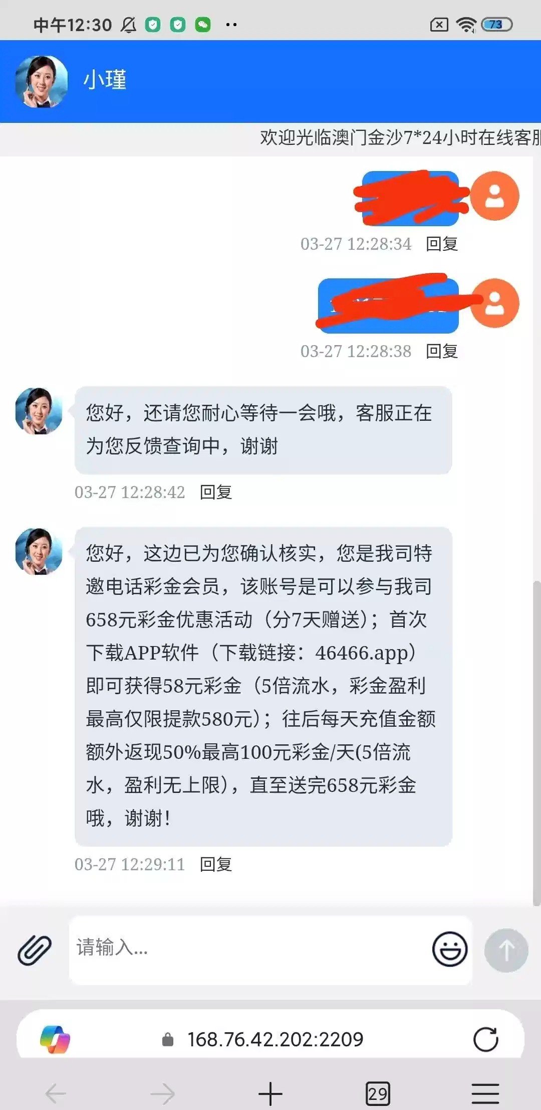 漏接电话的老哥,可以去碰碰,658元分七天送,我没有打出来,进去注册好,联系客服领取电话彩金,电话里头的链接,68992.vip,官网是46466.vip